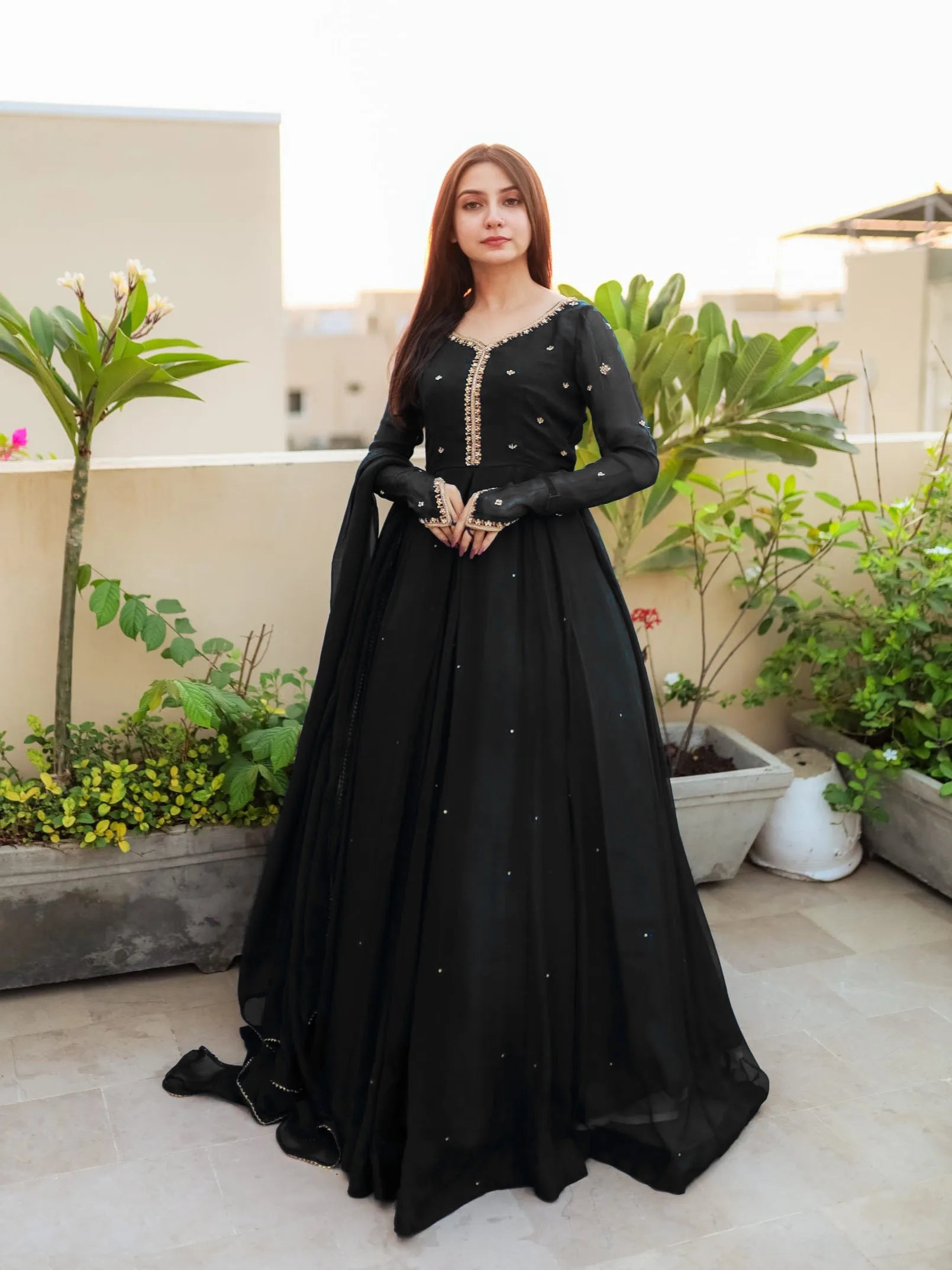 Neck, Sleeves Embroidered with Pearls Attached Long Maxi With Lace Work Dupatta 3PCs